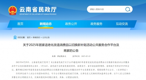 2025年5月19日,云南省民政厅正式发布了《云南省民政厅关于公开遴选2025年居家适老化改造消费品以旧换新补贴活动公共服务合作平台及征集商家的公告》的评审结果。广东中匠福健康产业股份有限公司(以下简称“中匠福”)凭借其卓越的产品质量和服务